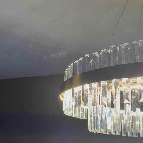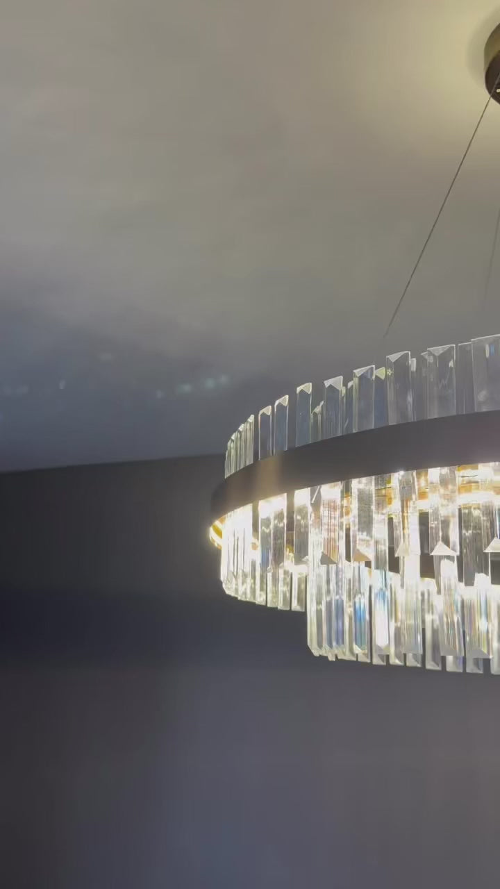 Elevate your space with timeless elegance and modern sophistication. This exquisite chandelier features a sleek circular design adorned with cascading tiers of precision-cut crystal prisms, delicately suspended from a radiant gold frame. Each crystal reflects and refracts the warm ambient light, creating a dazzling play of brilliance that transforms any room into a statement of luxury.